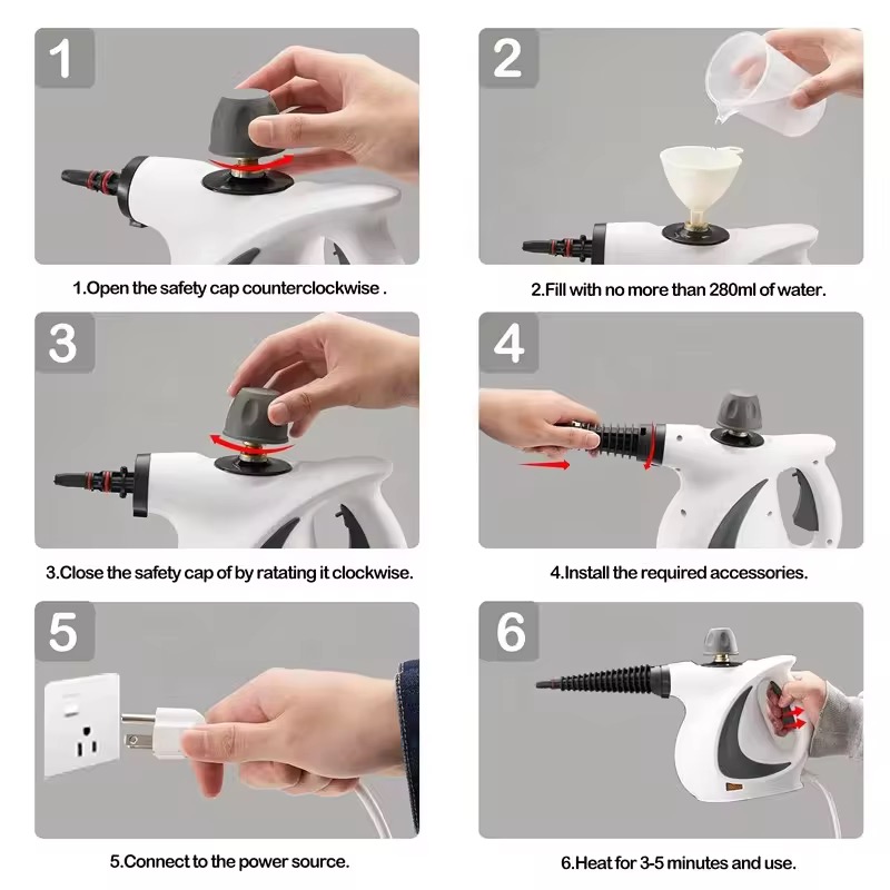 1. املأ خزان الماء (350 مل ماء نظيف) 2. أدخل في الكهرباء وانتظر 3-5 دقائق 3. اختر الملحق المناسب للسطح 4. اضغط زر البخار وابدأ التنظيف!